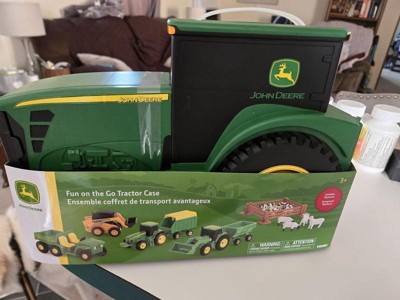 Give the gift of a complete farm collection all in one convenient carrying case! The John Deere on the Go Tractor Case features an 18-piece farm set within a tractor-shape carrying case to keep kids toys organized. This large toy case features a latch and carry handle making it a great toy set to take along when on the go. Opening it up reveals compartments that are perfect for storing the included vehicles, animals and fencing. With two tractors, a gator and a skid steer, there's plenty of ways to inspire creative play whether at home or on the go.